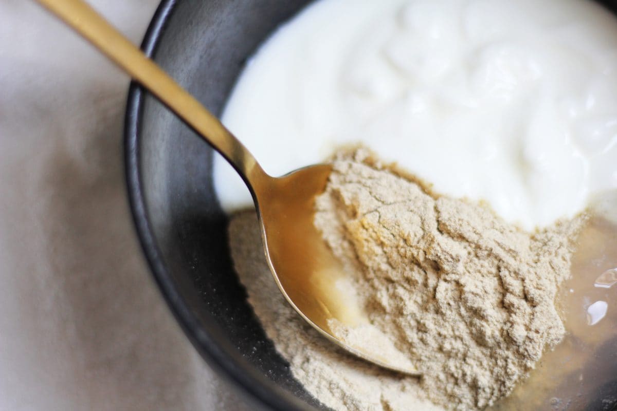 - Agrega el yogur y 1 cucharada de gel de aloe vera y mezcla por última vez.